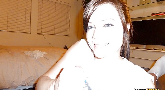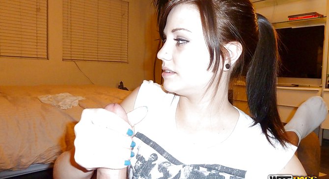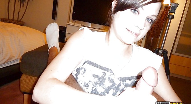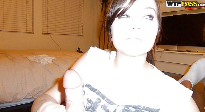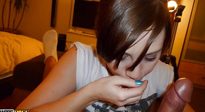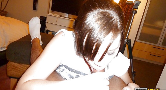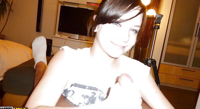 Достаточно молодая девушка каждый раз при встрече со своим парнем берет у него в рот белесый член, и получает сильное возбуждение в ходе минета. Краля в белой футболке обрадовалась очередному визиту своего чувака, который сразу же поспешил на кровать, заведомо предполагая, что девушке захочется отсосать пенис. И действительно, шлюха надрочила рукой член, и парень снял на телефон как она сладко лижет головку. Красотка сладко делает минет своему возбужденному парню, и гладит манду между ног.