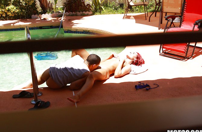 Услышав за окном подозрительные стоны, парень приоткрыл жалюзи и подсмотрел секс соседей, которые только разогревались в прелюдии чтобы потрахаться. Девушка с крашенными волосами легла на спину у бассейна, а ее муженек стал лизать сочную киску, которую он редко выпускал изо рта, а по ходу мял руками сиськи. Девушка чувствовала себя уже полностью возбужденной, да и член парня торчал кверху как вигвам. Очаровательная голенькая распутница садится на парня сверху и успешно прыгает на стояке.