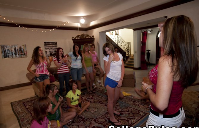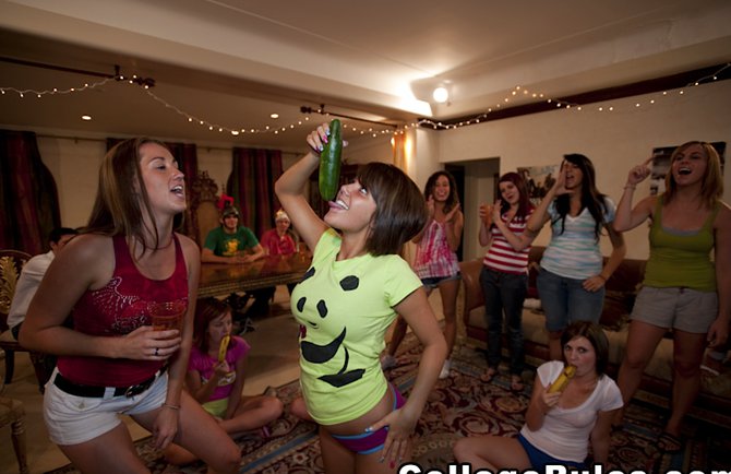 Ближе к вечеру начался запланированный секс студентов в общаге, которые не стеснялись друг друга и увлекались лесбийскими играми прямо на полу. Несколько девушек расположились на полу и взяли в руки бананы, кабачки и прочие игрушки, которыми в последствии они развлекали друг друга. Брюнетка вставила кабачок между больших сисек и страстно его отсасывает перед подругами, которые повторяют за ней интимные действия минета. Голые студентки - лесбиянки раздеваются в общаге и зажигательно трахают друг друга посреди комнаты различными игрушками в письки.