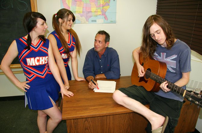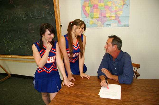 Когда преподаватель проводил урок с молодыми девушками приятной внешности, он уловил как они вульгарно ведут себя, и решил поддаться на их соблазн. Сидя на стуле у доски, мужчина увидел как одна из студенток подошла к нему вплотную , а затем неожиданно присела у ног, и расстегнула ширинку на его брюках, вывалив оттуда пенис с толстеньким стволом. Вторая девушка просто сняла с себя трусики, и присела на рабочий стол преподавателя, где она слегка смочила слюной свою киску, и надрочила небольшой клитор. Мужчина откровенно дал подрочить член студенткам с голыми телами.
