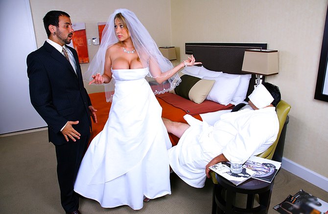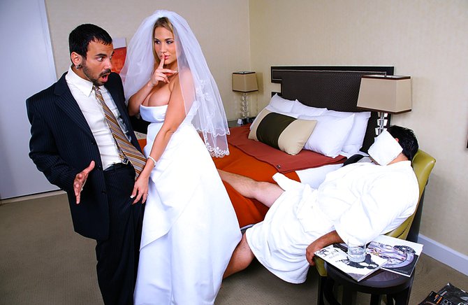 Когда вдоволь нагулявшийся супруг уснул в кресле, похотливая невеста трахается на свадьбе с поручителем, который рад стараться проверить на прочность киску девушки в свадебном платье. Пиршество получилось с размахом, поэтому толстый жених не рассчитал свои силы и уже к середине мероприятия уснул на целый час в кресле. Воспользовавшись этим моментом, его зажигательная супруга не стала терять времени и позволила себе насладиться перед крепкой семейной жизнью чужим членом, который она классно сосет прямо в свадебном платье. Очень распутная сиськатая невеста в чулочках, сняла с себя трусы и трахается на свадьбе со своим поручителем, который раз стараться разминать девушке плотную киску.