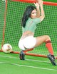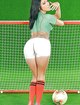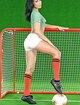 Девушка разделась на футбольном газоне до гола, и показывает яркий бодиарт, который смотрится очень эффектно. На ней надеты только гетры и бутсы, и красотка вертится в всей своей красе, принимая самые пикантные позы, которые только она может придумать. Присев попкой на мяч и раздвинув колени по сторонам, телочка кладет на писюху руку, и ощущает ее пульсацию и тепло. Она встает передом к небольшим вратарским воротам, и играет со стороны в сторону небольшой попкой, которая просматривается через слой краски на ягодицах.