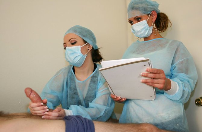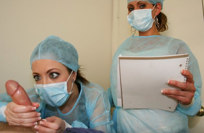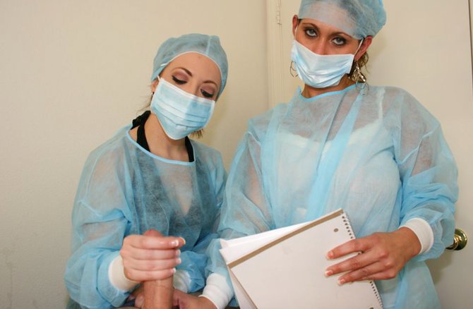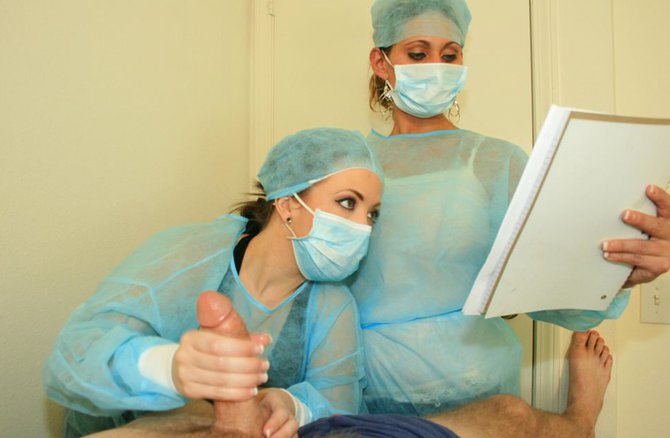 Доктор сделал несложную операцию пациенту и сказал медсестрам, чтобы она заканчивали процесс без него, однако темпераментная медсестра не смогла устоять перед соблазном, она дрочит пациенту стоячий член двумя руками. Когда девушка заканчивала зашивать место разреза пациента, она увидела, как его большой стояк напрягся и она сразу схватила его руками, как за спасательную соломинку. Большой болт настолько сильно произвел впечатление на медсестру, что она не желает его выпускать из рук и дрочит пациенту с большим пристрастием.