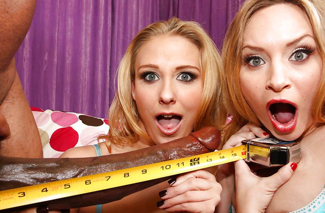 Две приятельницы после грандиозной вечеринки сняли парня, который с виду оказался полным простаком, однако когда дело подошло к сексу и одна из подруг ощутила в пизде хуище огромных размеров, то она поняла, что имеет дело с половым гигантом, каких свет не видывал. Первой реакцией девушек при виде члена была растерянность, но когда они совладали с ситуацией, то сразу же схватились за рулетку и принялись замерять ствол приятеля во всю длину. Довольный ебарь вставил в пизду одной подруге хуище только на половину и хорошенько ее отодрал, а после этого трахнул и вторую шмару.