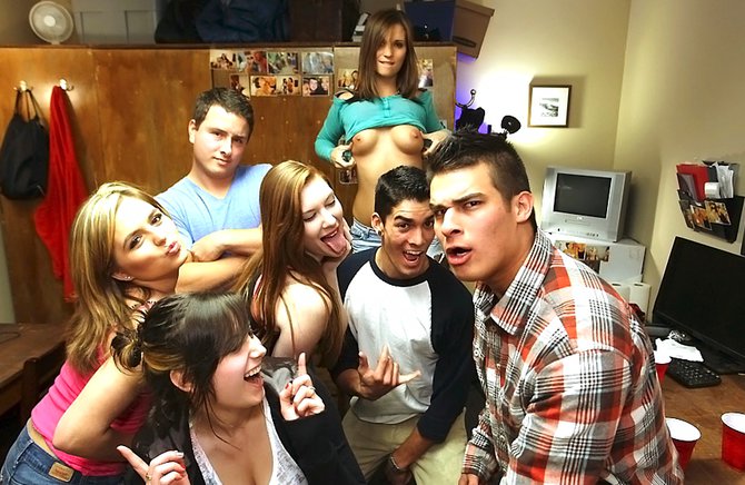 Обыкновенные студенты решили устроить клевую секс вечеринку прямо в комнате общежития, где собственно они и накрыли стол. Телочки слегка подогрелись спиртными напитками, и им было очень весло, особенно когда играла громкая, зажигательная музыка. Две шлюхи разделись и стали показывать прелести на теле, двигаясь по комнате хаотически. Одна из подруг неожиданно приняла позу раком, и взялась делать минет одному из парней, который был просто счастлив. В этот вечер девушки и парни отлично провели время в групповом сексе, насладившись телами друг друга.